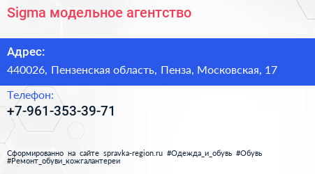 Sigma, модельное агентство по адресу 440026, Пензенская область, Пенза, Московская, 17 в дальнейшем Организация, размещена в следующих категориях: