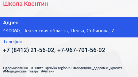Школа Квентин по адресу 440060, Пензенская область, Пенза, Собинова, 7 в дальнейшем Организация, размещена в следующих категориях: