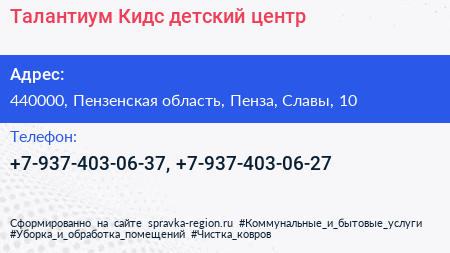 Талантиум Кидс, детский центр по адресу 440000, Пензенская область, Пенза, Славы, 10 в дальнейшем Организация, размещена в следующих категориях: