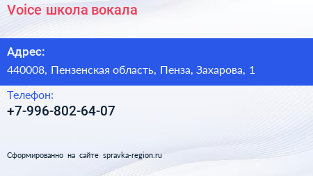 Voice, школа вокала по адресу 440008, Пензенская область, Пенза, Захарова, 1 в дальнейшем Организация, размещена в следующих категориях: