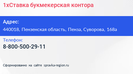 1xСтавка, букмекерская контора по адресу 440018, Пензенская область, Пенза, Суворова, 168а в дальнейшем Организация, размещена в следующих категориях: