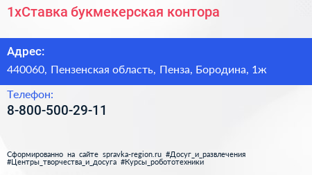 1xСтавка, букмекерская контора по адресу 440060, Пензенская область, Пенза, Бородина, 1ж в дальнейшем Организация, размещена в следующих категориях: