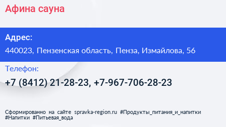 Афина, сауна по адресу 440023, Пензенская область, Пенза, Измайлова, 56 в дальнейшем Организация, размещена в следующих категориях: