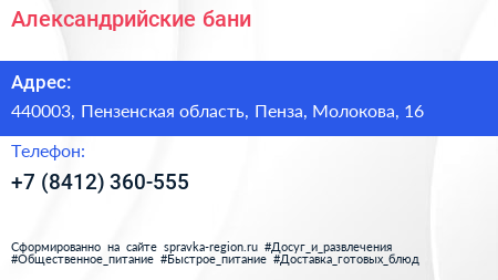 Александрийские бани по адресу 440003, Пензенская область, Пенза, Молокова, 16 в дальнейшем Организация, размещена в следующих категориях: