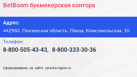 BetBoom, букмекерская контора по адресу 442960, Пензенская область, Пенза, Комсомольская, 10 в дальнейшем Организация, размещена в следующих категориях: