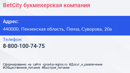 BetCity, букмекерская компания по адресу 440000, Пензенская область, Пенза, Суворова, 20а в дальнейшем Организация, размещена в следующих категориях: