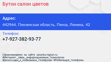 Бутон, салон цветов по адресу 442964, Пензенская область, Пенза, Ленина, 42 в дальнейшем Организация, размещена в следующих категориях: