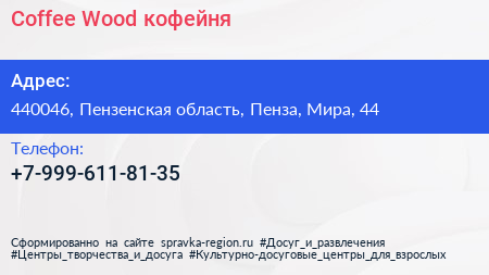 Coffee Wood, кофейня по адресу 440046, Пензенская область, Пенза, Мира, 44 в дальнейшем Организация, размещена в следующих категориях: