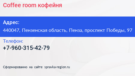 Coffee room, кофейня по адресу 440047, Пензенская область, Пенза, проспект Победы, 97 в дальнейшем Организация, размещена в следующих категориях: