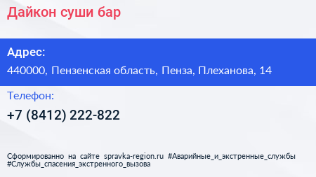 Дайкон, суши-бар по адресу 440000, Пензенская область, Пенза, Плеханова, 14 в дальнейшем Организация, размещена в следующих категориях: