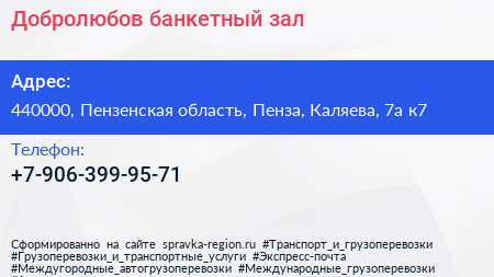 Добролюбов, банкетный зал по адресу 440000, Пензенская область, Пенза, Каляева, 7а к7 в дальнейшем Организация, размещена в следующих категориях: