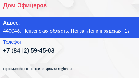 Дом Офицеров по адресу 440046, Пензенская область, Пенза, Ленинградская, 1а в дальнейшем Организация, размещена в следующих категориях: