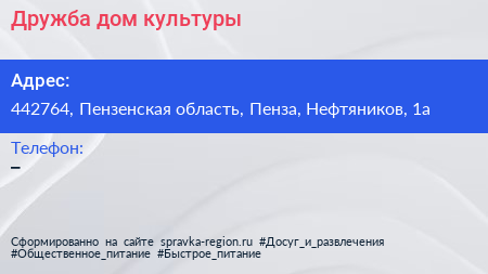 Дружба, дом культуры по адресу 442764, Пензенская область, Пенза, Нефтяников, 1а в дальнейшем Организация, размещена в следующих категориях: