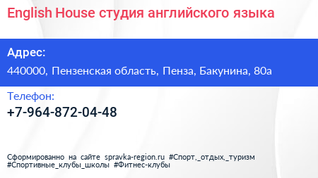 English House, студия английского языка по адресу 440000, Пензенская область, Пенза, Бакунина, 80а в дальнейшем Организация, размещена в следующих категориях: