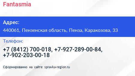 Fantasmia по адресу 440061, Пензенская область, Пенза, Каракозова, 33 в дальнейшем Организация, размещена в следующих категориях: