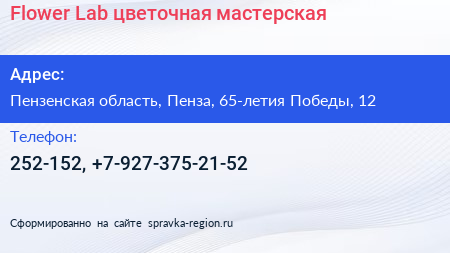 Flower Lab, цветочная мастерская по адресу Пензенская область, Пенза, 65-летия Победы, 12 в дальнейшем Организация, размещена в следующих категориях: