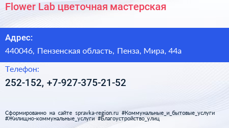 Flower Lab, цветочная мастерская по адресу 440046, Пензенская область, Пенза, Мира, 44а в дальнейшем Организация, размещена в следующих категориях: