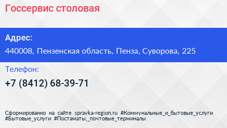 Госсервис, столовая по адресу 440008, Пензенская область, Пенза, Суворова, 225 в дальнейшем Организация, размещена в следующих категориях: