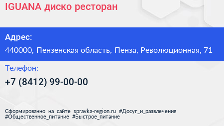IGUANA, диско-ресторан по адресу 440000, Пензенская область, Пенза, Революционная, 71 в дальнейшем Организация, размещена в следующих категориях: