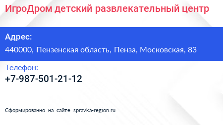 ИгроДром, детский развлекательный центр по адресу 440000, Пензенская область, Пенза, Московская, 83 в дальнейшем Организация, размещена в следующих категориях: