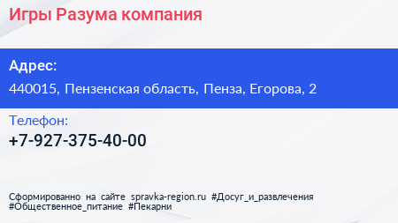 Игры Разума, компания по адресу 440015, Пензенская область, Пенза, Егорова, 2 в дальнейшем Организация, размещена в следующих категориях: