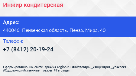 Инжир, кондитерская по адресу 440046, Пензенская область, Пенза, Мира, 40 в дальнейшем Организация, размещена в следующих категориях: