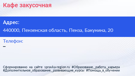 Кафе-закусочная по адресу 440000, Пензенская область, Пенза, Бакунина, 20 в дальнейшем Организация, размещена в следующих категориях: