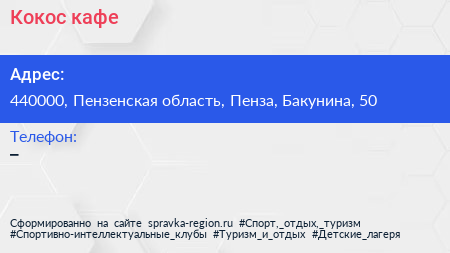 Кокос, кафе по адресу 440000, Пензенская область, Пенза, Бакунина, 50 в дальнейшем Организация, размещена в следующих категориях: