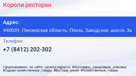 Короли, ресторан по адресу 440039, Пензенская область, Пенза, Заводское шоссе, 3а в дальнейшем Организация, размещена в следующих категориях: