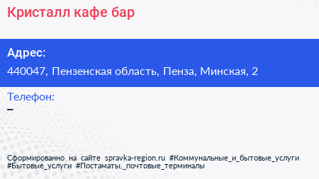 Кристалл, кафе-бар по адресу 440047, Пензенская область, Пенза, Минская, 2 в дальнейшем Организация, размещена в следующих категориях: