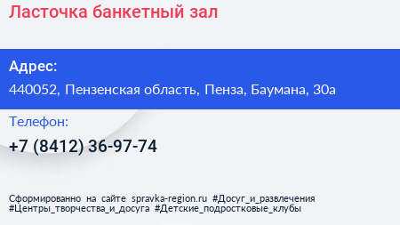 Ласточка, банкетный зал по адресу 440052, Пензенская область, Пенза, Баумана, 30а в дальнейшем Организация, размещена в следующих категориях: