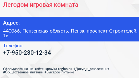Легодом, игровая комната по адресу 440066, Пензенская область, Пенза, проспект Строителей, 1в в дальнейшем Организация, размещена в следующих категориях: