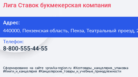 Лига Ставок, букмекерская компания по адресу 440000, Пензенская область, Пенза, Театральный проезд, 2 в дальнейшем Организация, размещена в следующих категориях: