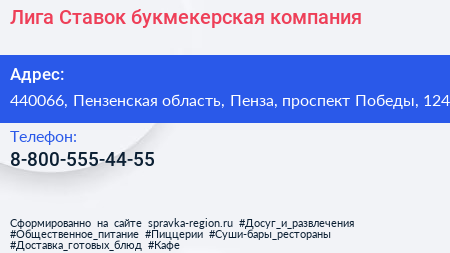 Лига Ставок, букмекерская компания по адресу 440066, Пензенская область, Пенза, проспект Победы, 124 в дальнейшем Организация, размещена в следующих категориях: