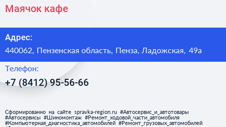 Маячок, кафе по адресу 440062, Пензенская область, Пенза, Ладожская, 49а в дальнейшем Организация, размещена в следующих категориях: