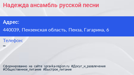 Надежда, ансамбль русской песни по адресу 440039, Пензенская область, Пенза, Гагарина, 6 в дальнейшем Организация, размещена в следующих категориях: