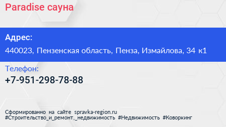 Paradise, сауна по адресу 440023, Пензенская область, Пенза, Измайлова, 34 к1 в дальнейшем Организация, размещена в следующих категориях: