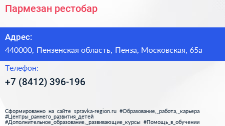 Пармезан, рестобар по адресу 440000, Пензенская область, Пенза, Московская, 65а в дальнейшем Организация, размещена в следующих категориях: