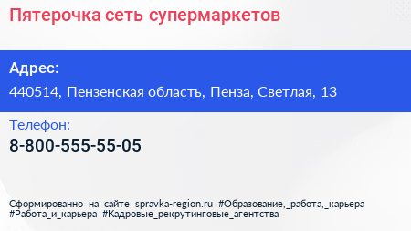 Пятерочка, сеть супермаркетов по адресу 440514, Пензенская область, Пенза, Светлая, 13 в дальнейшем Организация, размещена в следующих категориях:
