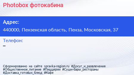 Photobox, фотокабина по адресу 440000, Пензенская область, Пенза, Московская, 37 в дальнейшем Организация, размещена в следующих категориях: