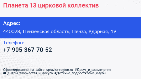 Планета 13, цирковой коллектив по адресу 440028, Пензенская область, Пенза, Ударная, 19 в дальнейшем Организация, размещена в следующих категориях: