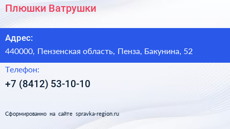 Плюшки Ватрушки по адресу 440000, Пензенская область, Пенза, Бакунина, 52 в дальнейшем Организация, размещена в следующих категориях: