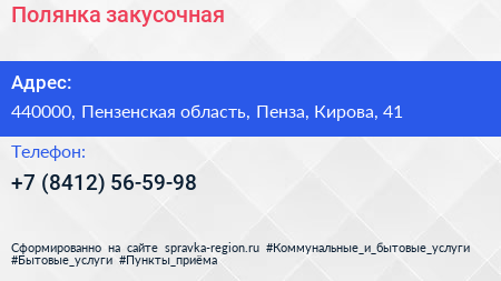 Полянка, закусочная по адресу 440000, Пензенская область, Пенза, Кирова, 41 в дальнейшем Организация, размещена в следующих категориях: