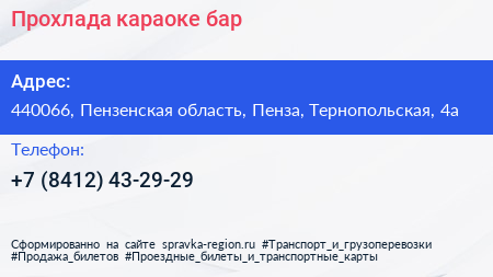 Прохлада, караоке-бар по адресу 440066, Пензенская область, Пенза, Тернопольская, 4а в дальнейшем Организация, размещена в следующих категориях: