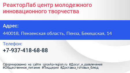 РеакторЛаб, центр молодежного инновационного творчества по адресу 440018, Пензенская область, Пенза, Бекешская, 14 в дальнейшем Организация, размещена в следующих категориях: