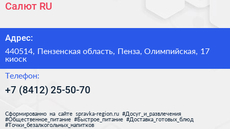 Салют.RU по адресу 440514, Пензенская область, Пенза, Олимпийская, 17 киоск в дальнейшем Организация, размещена в следующих категориях: