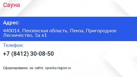 Сауна по адресу 440014, Пензенская область, Пенза, Пригородное Лесничество, 5а к1 в дальнейшем Организация, размещена в следующих категориях: