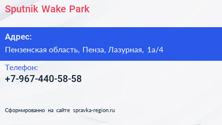 Sputnik Wake Park по адресу Пензенская область, Пенза, Лазурная, 1а/4 в дальнейшем Организация, размещена в следующих категориях: