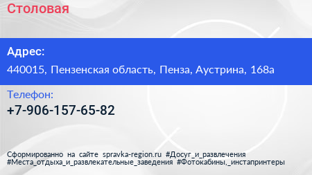 Столовая по адресу 440015, Пензенская область, Пенза, Аустрина, 168а в дальнейшем Организация, размещена в следующих категориях: