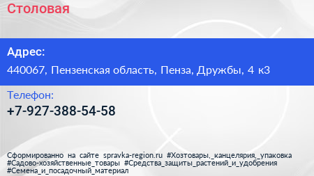 Столовая по адресу 440067, Пензенская область, Пенза, Дружбы, 4 к3 в дальнейшем Организация, размещена в следующих категориях: